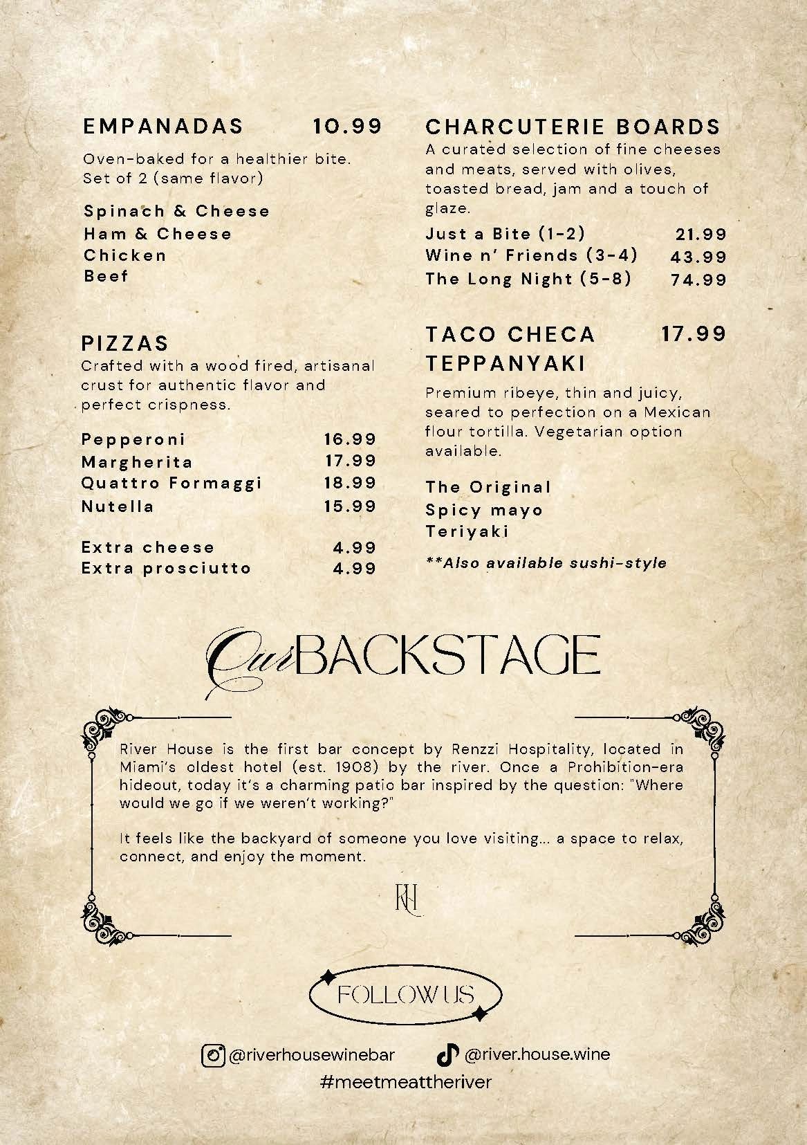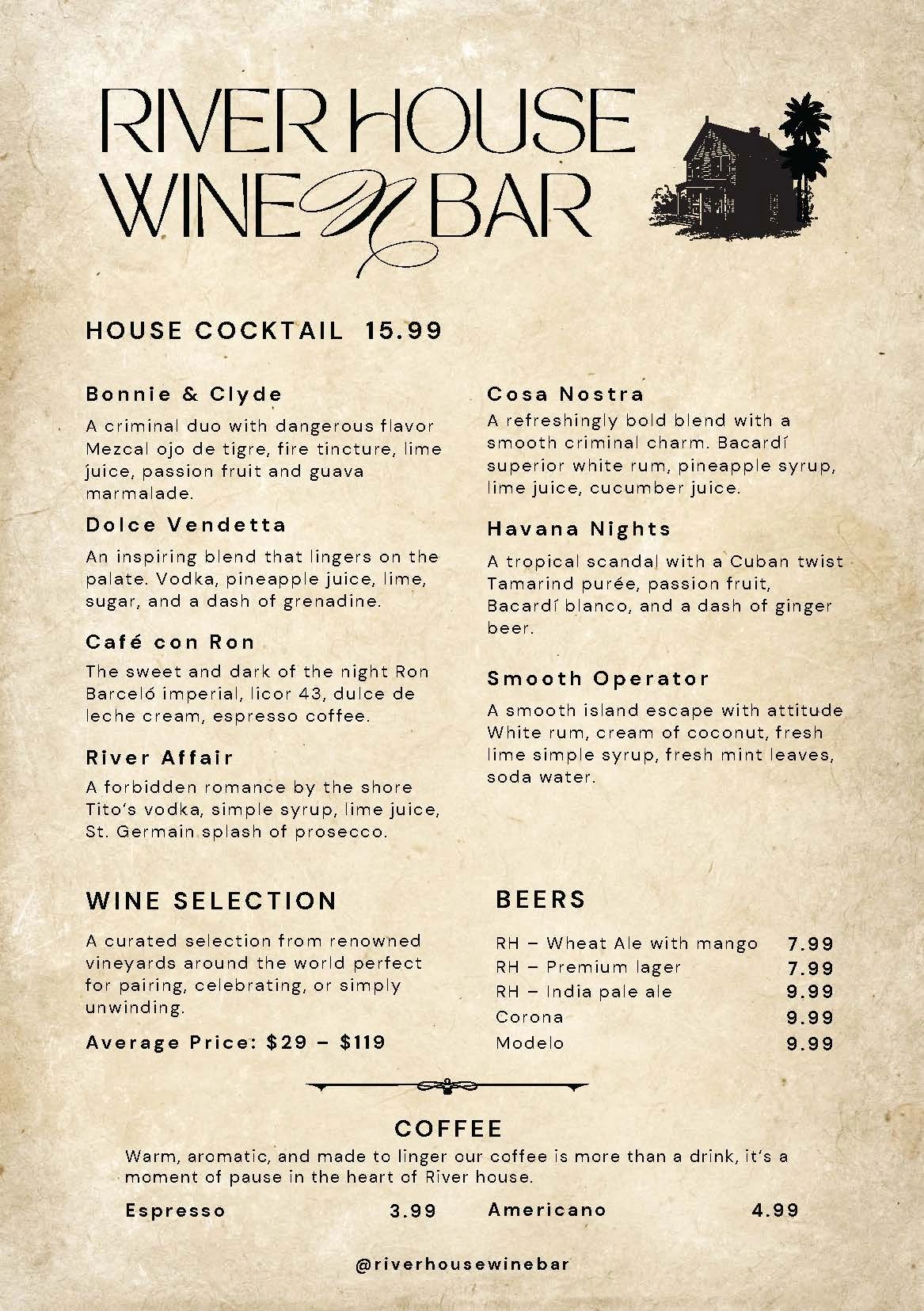 Nestled within Miami’s oldest operating hotel and perched along the iconic Miami River, River House Wine & Bar is a hidden gem where history, charm, and warm hospitality come together. With its vintage allure, intimate ambiance, and scenic riverfront views, our bar offers a unique retreat for those who appreciate fine wines, artisanal tapas, and the comforting aroma of a wood-fired pizza oven.